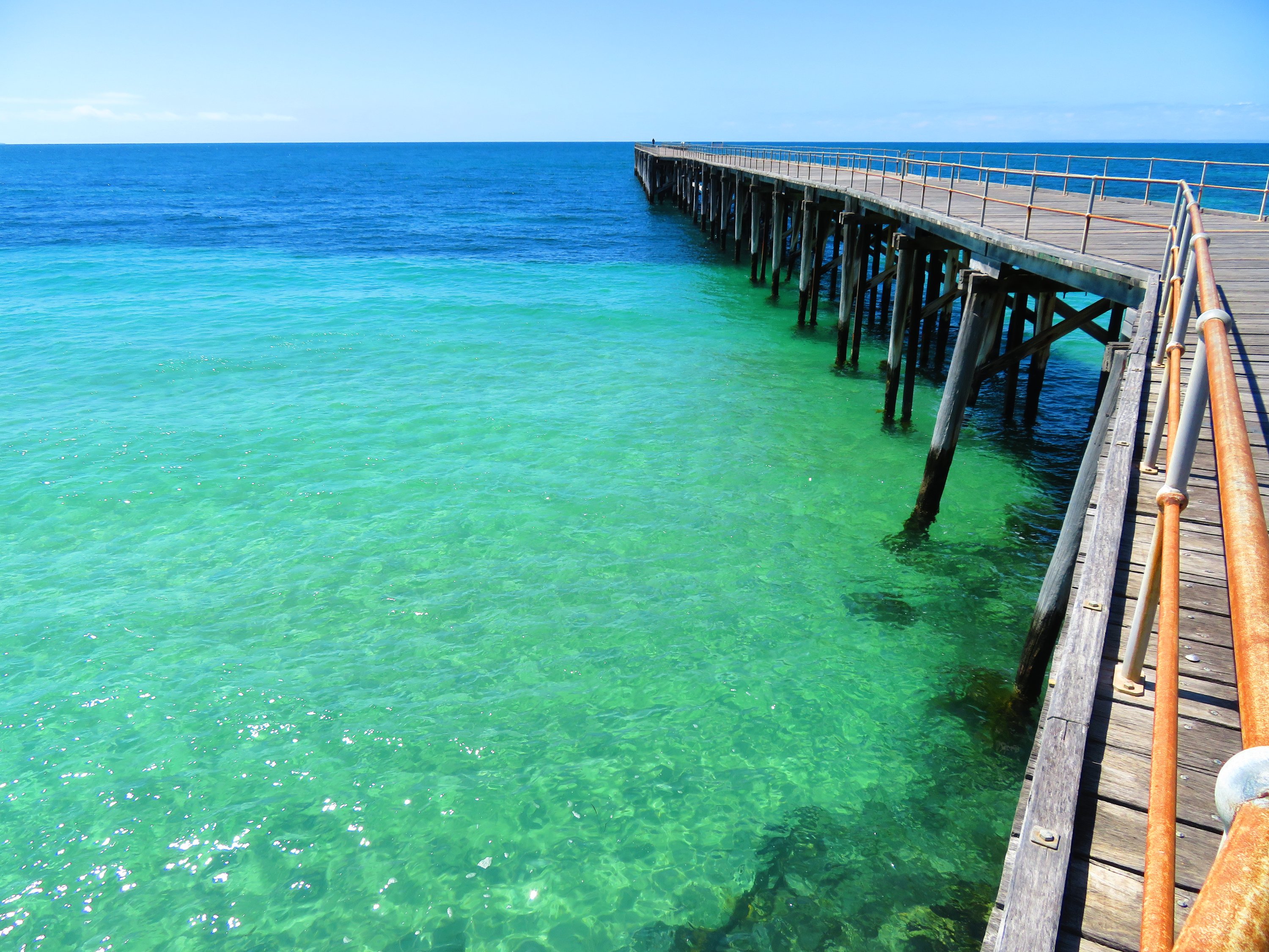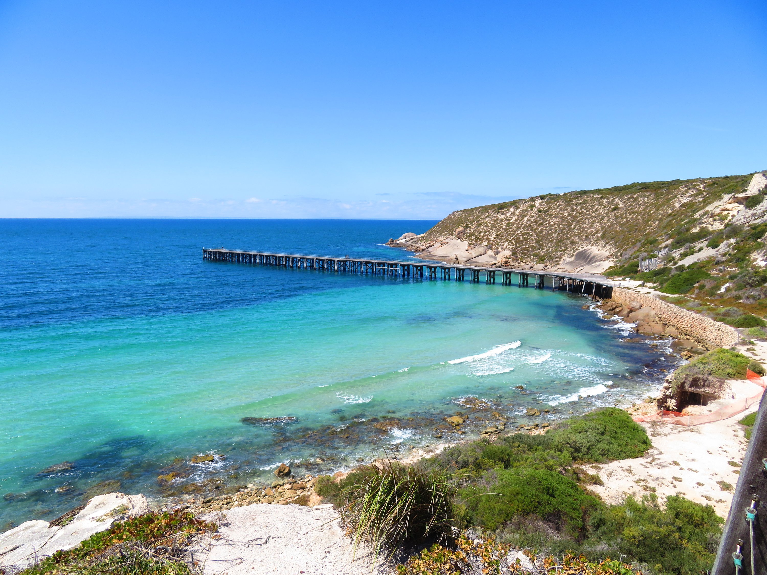 The Yorke Peninsula has 700kms of coastline, with amazing beaches and scenery. There are a variety of towns, both coastal and inland to explore. Each one is unique in its history and landscape. Although we based ourselves in Wallaroo we didn’t actually explore much of the town itself. They have a Heritage and Nautical Museum, Marina, jetty, playground, golf club, and beautiful beaches. Copper was discovered in 1859 and the ore exported through the port. Today it is a big exporter of grain. Wallaroo, along with the towns of Kadina and Moonta, is also part of the Copper Triangle, because Copper was mined there from the late 19th century. The three towns are also known for their Cornish ethnicity and the area is known as Little Cornwall. Every two years a large Cornish themed festival, Kernewek Lowender, is held and claims to be the world’s largest Cornish Festival outside of Cornwall. The festival is being held this year from the 13th – 19th May. Unfortunately, we will be in Alice Springs, but we have put it in the calendar for 2021! Moonta is another quaint town and we enjoyed walking along the main street before having lunch in The Cornish Kitchen. Ray and Liz had the Cornish Pasty and gave it top marks for taste and authenticity. A five-minute drive from Moonta is Moonta Bay, and wow, how stunning is this beach! There is a long jetty which we walked along and saw quite a few folk fishing and crabbing. Halfway along the jetty, there is an area that has been fenced off as a safe swimming spot.